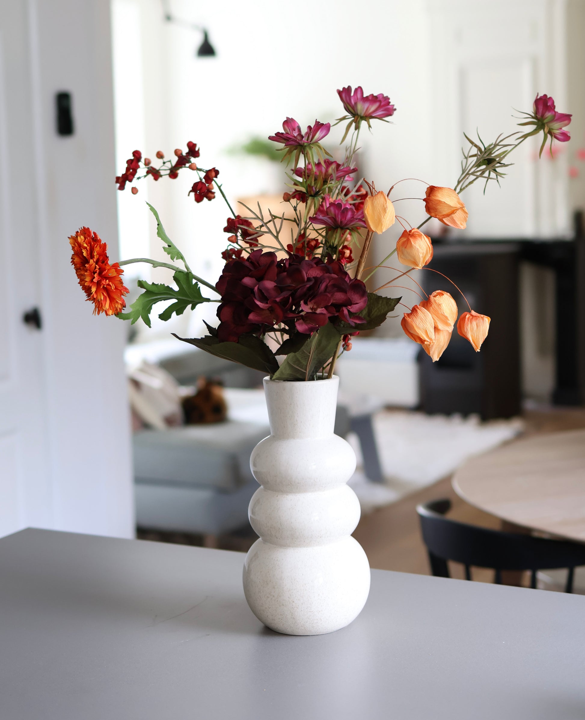 Haal de warme kleuren van de herfst in huis met het Zijden Boeket Faye. Dit boeket heeft zachte herfsttinten en een prachtige burgundy hortensia als blikvanger. Sfeervol, stijlvol en onderhoudsvriendelijk – ideaal voor op tafel, in de vensterbank of als cadeau voor iemand speciaal.